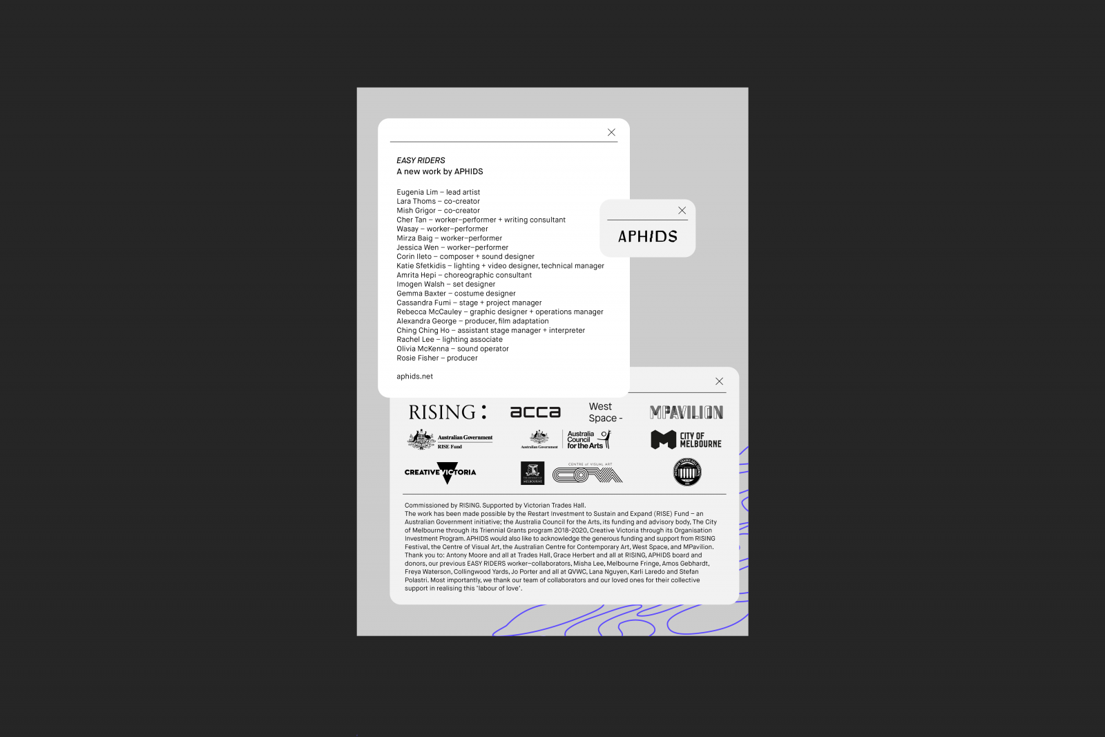 EASY RIDERS was commissioned by RISING. Supported by Victorian Trades Hall. The work has been made possible by the Restart Investment to Sustain and Expand (RISE) Fund – an Australian Government initiative; the Australia Council for the Arts, its funding and advisory body, The City of Melbourne through its Triennial Grants program 2018-2020, Creative Victoria through its Organisation Investment Program. APHIDS would also like to acknowledge the generous funding and support from partners; RISING Festival, the Centre of Visual Art, The University of Melbourne, the Australian Centre for Contemporary Art, West Space, Trades Hall and MPavilion.