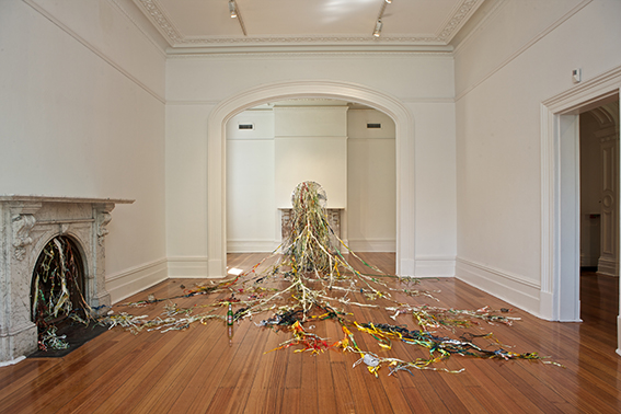 CUTTINGS was an installation with performances exploring divergent approaches to sculpture and sound by five artists and musicians. Works included a massive latex sound sculpture by Natasha Anderson; rosewood resonant percussive sculptures by Rosemary Joy; an installation and event using hand-made paper forms and wind by Sarah Pirrie; automated kinetic sound sculptures using motors, polystyrene, re-appropriated technology created and performed by Dale Gorfinkel and a percussive soundscape of found objects and ice made and performed by Vanessa Tomlinson.