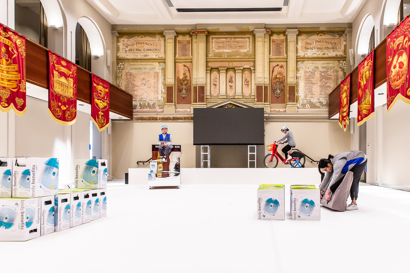EASY RIDERS is a site-responsive performance exploring work, precarity and the physical body in the digital age. Developed through a unique collaboration between artists and on-demand workers of the platform or ‘gig’ economy, EASY RIDERS considers how Silicon Valley’s technology and platform capitalism shape our bodies, behaviours, perceptions of time and our imaginaries. Inhabiting Trades Hall, EASY RIDERS honours the experiences and physicality of contemporary on-demand workers within the historical ‘beating heart’ of the labour movement and the eight-hour work day in Australia. EASY RIDERS asks: whose time = whose money? How much of our daily lives should be outsourced to others? At our most ‘efficient’, are we Übermenschen or über-assholes? Through movement, voice and collective action between ‘independent contractors’ of the gig economy and artists—come and witness a shift like no other unfold. The future of work is already here.