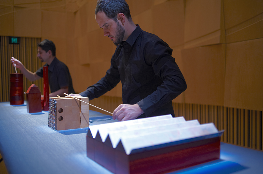 An international percussion work of miniature proportions, System Building fuses percussion and architecture on an intimate scale.